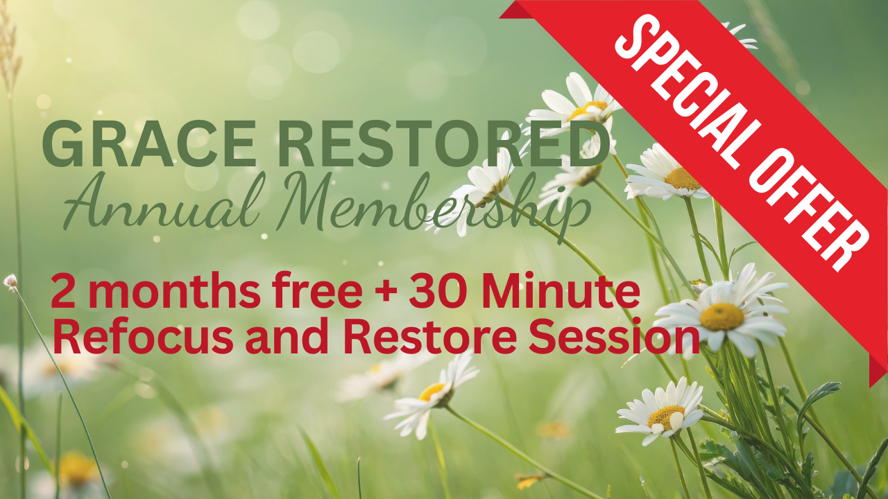 New members who enroll in the Grace Restored Annual Membership will get 2 months free and receive a complimentary 30-minute Refocus and Restore Session with Kathy Cunningham.